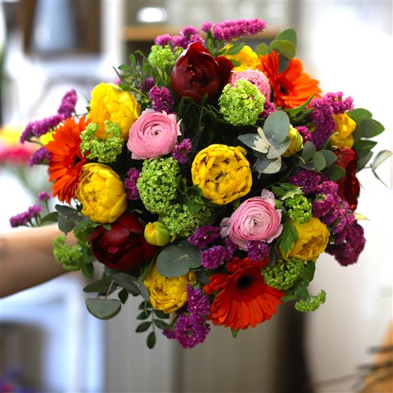 Elevate any space with the Tutti Frutti bouquet, a vibrant arrangement designed for maximum visual impact. This selection moves away from traditional muted tones, opting instead for a bold and energetic palette that demands attention.