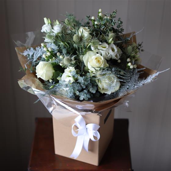 A stunning hand-tied bouquet featuring a luxurious blend of white roses and white lisianthus, accented with delicate seasonal blooms and a touch of frosted foliage. This exquisite arrangement evokes the serene beauty and crisp elegance of a winter wonderland. Perfect for gifting or adding a touch of winter magic to your home.